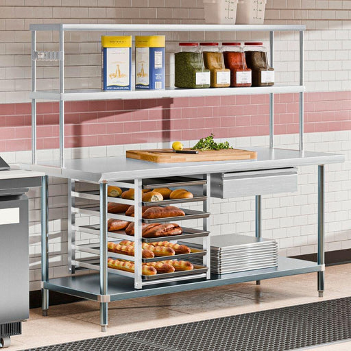 View full details60" x 30" Stainless Steel Prep Table w/ Overshelves, Drawers, Bun Pan Rack & 6 Bun Pans