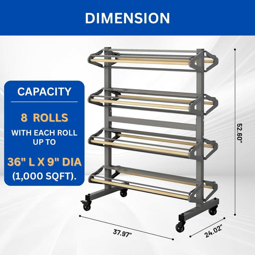 View full details8 Rolls Horizontal Paper Rack with Cutter & Casters, For Use with 36"W Rolls, 8 Deck Paper Roll Dispenser