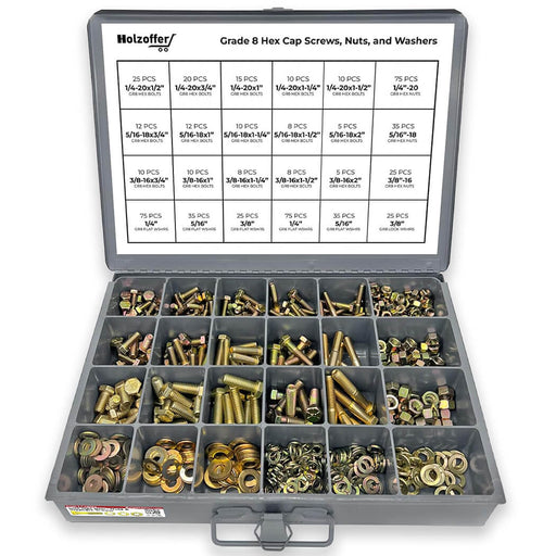 Complete Grade 8 Hardware Assortment – 574 Pieces Includes high-strength Grade 8 hex cap screws, finished hex nuts, SAE flat washers, and split lo...