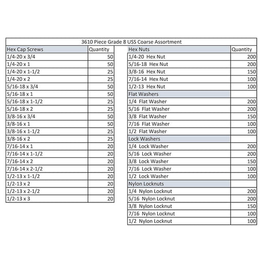Comprehensive Grade 8 Hardware Assortment – 3,610 Pieces This 3,610-piece Grade 8 bolt bin kit provides a complete selection of high-strength coar...